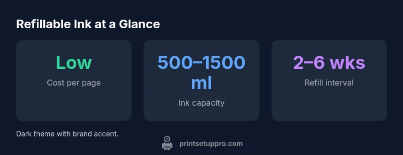 Refillable ink cartridges, or ink-tank systems, store liquid ink in internal reservoirs that you replenish using bottles or compatible refill packs. Unlike traditional sealed cartridges, these printers are designed to be topped up rather than replaced entirely. The core advantage is cost efficiency for high-volume printing and a reduction in plastic waste. In daily use, you’ll notice longer intervals between cartridge changes, and a preference for bulk ink purchases. The setup requires careful handling during refills to avoid introducing air bubbles or contaminating the ink paths. The Print Setup Pro team emphasizes following the manufacturer’s ink guidelines and performing routine maintenance to preserve print quality. For readers evaluating whether a printer has refillable ink cartridges, check the product family name or feature list for “ink tank,” “EcoTank,” or “front-fill/auto-fill” configurations. The key takeaway is straightforward: refillable ink printers exist to keep your ink costs predictable while simplifying long-term maintenance when used correctly.