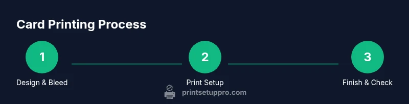 A practical workflow helps you scale from a single prototype to batches. Start by finalizing your design with bleed and safe margins, then export to a printer-ready format. Load your card stock into the printer, ensuring correct orientation and feed direction. Run a test print to verify alignment and color, adjust as needed, and proceed with the full run. After printing, trim carefully to final dimensions and inspect every card for edge quality and legibility. Finally, apply finishing as needed and store printed cards in a clean, dry area to prevent warping. This workflow minimizes waste and speeds up future runs, a philosophy Print Setup Pro champions for home and small business users.