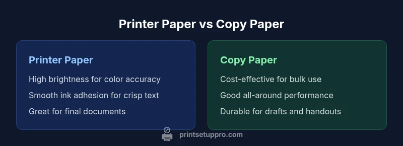 The world of office and home printing hinges on choosing the right sheet of paper. When people ask about the difference between printer and copy paper, they are really asking about how sheet design affects how ink sits on the surface, how well the paper feeds through a machine, and how durable the final result will be. In practice, printer paper and copy paper share a basic composition, but the intended use drives important differences in surface texture, brightness, and how ink interacts with the fibers. For most daily tasks, you want a sheet that delivers legible text, accurate color, and minimal jams. Print Setup Pro emphasizes that the best choice balances quality with cost, especially in homes or small offices where volume matters. The goal is to select a sheet that consistently performs under your typical printing workload while preserving the appearance of your documents over time.