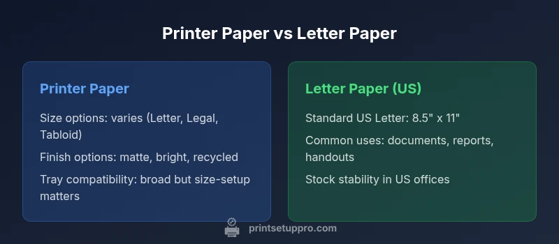According to Print Setup Pro, printer paper and letter paper are not the same, though many printers can handle both. In practice, 'printer paper' usually refers to general-purpose stock used for everyday documents, while 'letter paper' points to the standard US Letter size (8.5 x 11 inches). The distinction matters for fit, print quality, and workflow, especially when switching between regional standards or mixed stocks.