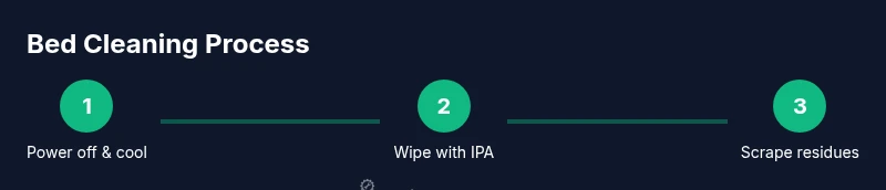 Dampen a lint-free cloth with IPA and wipe the bed in smooth, even strokes. Avoid soaking; use just enough liquid to loosen oils and residues. For PEI or textured surfaces, use a lighter touch to avoid micro-scratches.