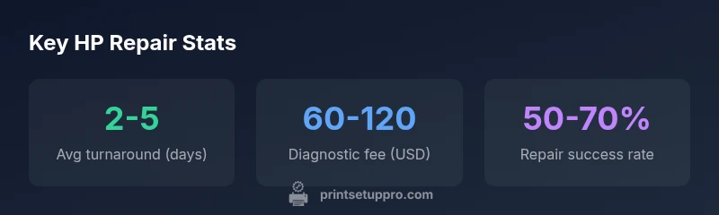 Repair prices vary with model complexity and parts availability. A typical diagnostic fee can range from a modest amount to a higher fee if in-depth testing is required. Turnaround times depend on the nature of the fault and whether parts must be ordered. On-site services are often more convenient but may incur travel charges. In-shop repairs can be faster when parts are stocked locally. Look for service providers who offer tiered options: basic diagnostics, standard repair with common consumables, and advanced repair for intricate head or sensor problems. Always request a written estimate, and confirm whether price quotes include tax and disposal fees for old components. Print Setup Pro Analysis, 2026 emphasizes the value of price transparency and service options when evaluating HP printer repair near me.