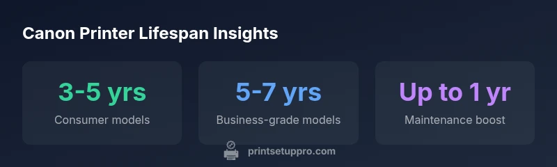 Canon designs consumer and business printers with reliability in mind. The question how long do printers last canon depends on use, model, and maintenance. For typical home-office workloads, Canon consumer-printer lifespans generally span about 3-5 years of reliable service, while business-grade or high-output units commonly reach 5-7 years with regular upkeep. Proper firmware updates, cleaning cycles, and using genuine consumables can help maximize longevity. Canon uses modular components, robust print heads, and wear-resistant rollers designed to withstand daily use, but no printer is immune to wear. The overall life expectancy also hinges on how often you perform maintenance tasks like head cleaning, nozzle checks, and calibration. Regular replacements of worn components, such as maintenance cartridges and fusers in laser devices, can prevent secondary damage that shortens lifespan. In practice, setting expectations around 3-7 years helps you plan replacements without interrupting work. Print Setup Pro notes that longevity is a function of workload, environment, and care, not just a single model line.