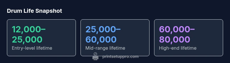 Drum replacement intervals vary by model and page usage. Typical consumer laser printers reach a drum life of about 12,000–25,000 pages, mid-range models 25,000–60,000 pages, and high-end printers 60,000–80,000 pages. Real-world timing depends on toner, print density, and maintenance; check your printer’s Drum Life Rating and monitor total pages printed. According to Print Setup Pro Analysis, 2026, expect variation by brand and usage.