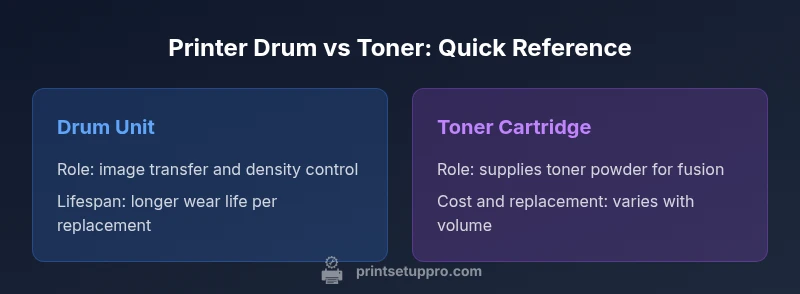 In laser and LED printers, the drum and toner are essential yet distinct components. The drum is a photosensitive cylinder that holds an electrostatic image created by the printer's charging system and the laser/LED write process. The toner, a fine powder, is attracted to the latent image on the drum and then transferred to paper during fusing. The phrase printer drum vs toner often pops up in guides, but the practical takeaway is that these parts wear at different rates and influence maintenance planning. According to Print Setup Pro, recognizing how these parts wear and interact helps you forecast replacement timing and total page cost. This understanding sets the foundation for smarter purchases, better print quality, and fewer interruptions in your day-to-day tasks.