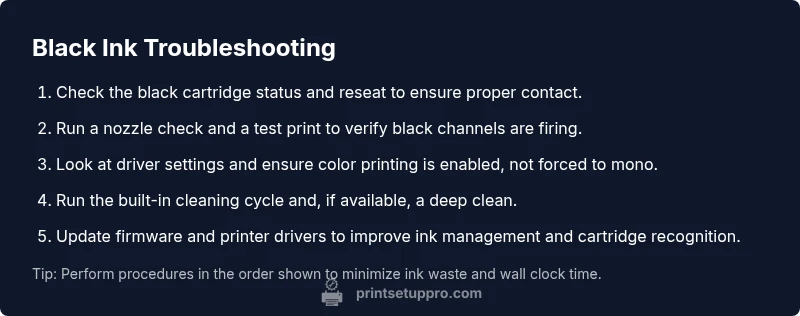 Most often, a printer not printing black is caused by cartridge or print head issues. According to Print Setup Pro, start by checking the black cartridge status, perform a nozzle check, and run a quick head-cleaning if needed. Then verify printer settings and paper/type profiles to rule out simple config problems. This fast path can save a service call and restore reliable black output quickly.