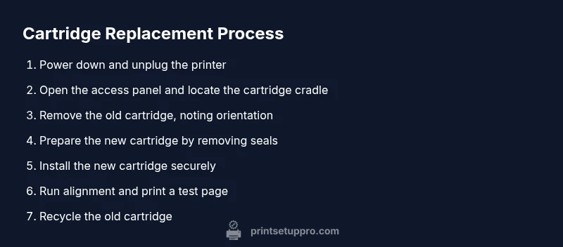 Printer cartridges come in two broad families: ink cartridges for inkjet printers and toner cartridges for laser printers. Each type has its own chemistry, color configurations, and maintenance considerations. Understanding what you’re replacing helps prevent wasted purchases and poor results. According to Print Setup Pro, a properly replaced cartridge is essential for consistent color, sharp text, and reliable operation. When a printer indicates low ink or low toner, prints may fade, colors may shift, or a few pages can fail to feed correctly. Replacement isn’t just about having a fresh bottle or block; it’s about matching the cartridge to the exact model, using the correct color or size, and following the manufacturer’s installation instructions. If you ignore compatibility, you risk leaks, clogged print heads, or misalignment that forces you to repeat the process. In this section you’ll learn how to identify your cartridge type, what information to collect before buying, and how to avoid common missteps that create more work later.