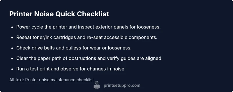 A systematic approach helps you map a symptom to a likely cause. Start by categorizing the sound: is it a vibration, rattle, grinding, or buzzing? Next, determine when the noise occurs: during idle, during feed, or only on certain pages. If the noise is synchronized with movement, check mechanical links like belts, gears, and the roller assembly. If it happens during a print job but not when idle, inspect the paper path and print head area. Use a process of elimination: rule out obvious causes first, then test after each adjustment to observe changes. Print Setup Pro recommends documenting each finding to track progress and narrow down the root cause.