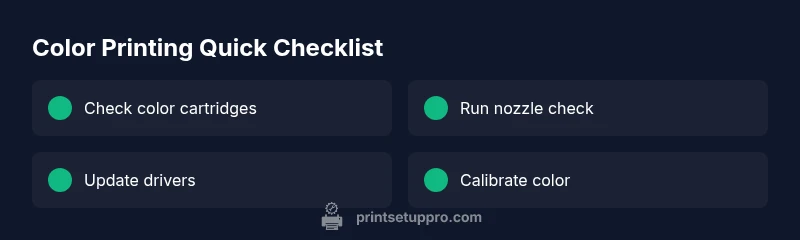 Color printing issues are a common headache for home offices and students, especially when deadlines are looming. The problem often starts with easy-to-fix culprits rather than a mysterious hardware fault. According to Print Setup Pro, most color problems stem from three areas: ink supply, color management, and software/drivers. Before you panic, approach the issue methodically: check cartridges, verify color settings across your apps and printer, and run a quick calibration. This section lays out a practical, repeatable plan so you can diagnose quickly, minimize waste, and keep color output consistent across devices. By sticking to a calm, structured flow, you’ll save time and frustration on future color-print tasks.