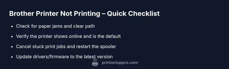 According to Print Setup Pro, when brother printer is not printing, most issues stem from a handful of common causes you can verify quickly. Paper jams, a paused or offline print queue, or outdated drivers are the usual culprits. By following a simple, methodical approach, you can isolate the problem without guessing, saving time and avoiding costly service calls. This guide focuses on practical steps you can take right away, with a tone of urgency to get your documents out on time. Whether you’re at a home office or a small business, the goal is to restore reliable printing with minimal disruption.