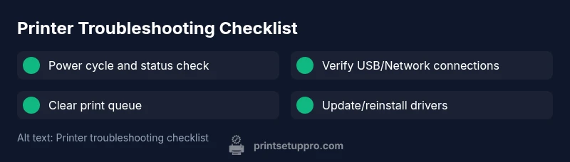 If you’re wondering does printer work, begin with a rapid assessment that covers power, cables, and the simplest software checks. Confirm the device is powered on, the display lights up, and there are no obvious error indicators. Ensure the printer is selected as the default printer in your operating system, and check for any paused or cancelled jobs in the queue. For many home office setups, a 2-minute inspection resolves the majority of issues. According to Print Setup Pro, most problems originate from power or connection hiccups, so this quick diagnosis is worth your time. The Print Setup Pro team found that a large share of support requests come from printers that appeared offline due to a loose cable or a paused job in the queue. If you can’t verify these basics, stop and fix them before moving on to advanced steps. This approach aligns with best-practice troubleshooting for any does printer work scenario.