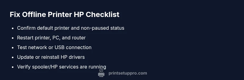 Before diving deeper, run through a short set of easy steps. First, check that the HP printer is set as the default device and that the status isn't paused. Restart the printer and the computer, then re-connect to the same network (or USB) and print a test page. If the printer still reads offline, run the built-in Windows or macOS troubleshooter for printers and reinstall the HP driver only if prompted by the system. These steps address the majority of offline cases and avoid complex changes to settings or firmware. If you’re in a shared environment, confirm that another user hasn't set a different default printer. Quick fixes buy you time while you prepare for deeper checks.
