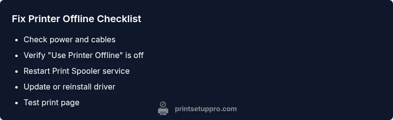 According to Print Setup Pro, when Windows 11 shows a printer as offline, the two most common culprits are driver problems or a stopped Print Spooler service. Start with quick checks: verify the device is online, ensure 'Use Printer Offline' is not enabled, and restart the Print Spooler. Update or reinstall the printer driver if needed. If the issue persists, print a test page from another device or a different USB port to rule out cable or port faults.