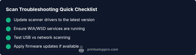 The symptom 'printer can print but not scan' is frustrating and confusing, especially when you rely on one device for both tasks. According to Print Setup Pro, the root cause is almost always software-related rather than a bad hardware component. Most modern printers use a shared engine for printing and scanning; a driver or service that governs scanning can fail independently of the print subsystem. A corrupted scanner driver, a disabled WIA/WSD service, or outdated firmware will prevent scanning while printing remains unaffected. The result is a greyed-out scan option, a message that scanning is unavailable, or an OCR feature that refuses to launch. Understanding the distinction between hardware failure and software issues helps you triage quickly and avoid unnecessary repairs. This guide focuses on practical steps you can take in the next 20-30 minutes to restore scanning capability, with safety and prevention tips woven in.