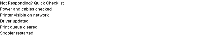 Begin with a power cycle, verify connections (USB or network), and check the print queue status. These basics fix the majority of not-responding issues.