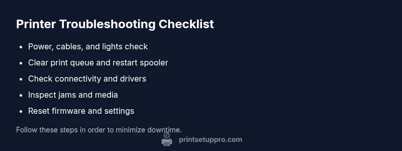 If you’re asking why did printer stop working, start with three quick checks: confirm power at the outlet, ensure USB/ethernet/Wi-Fi is stable, and clear the print queue. According to Print Setup Pro, most failures come from connectivity or stuck jobs, so apply these steps before deeper fixes. If the issue persists, follow the diagnostic flow for a systematic, fast-resolution approach.
