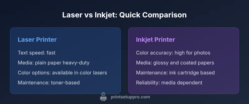 In any office or home setup, the most meaningful questions are about workload, speed, cost, and print quality. According to Print Setup Pro, understanding the difference between a laser printer and an inkjet helps you map your needs to printer technology. A laser device uses dry toner and a rotating drum; an inkjet dispenses microscopic droplets of liquid ink onto media. This fundamental distinction drives performance characteristics that matter for documents, graphics, and photos. In this section, we’ll outline the decision factors you should weigh before committing to either technology, including typical use cases for home offices, students, and small businesses. The goal is to give you a clear framework to match your print goals with technical trade-offs.