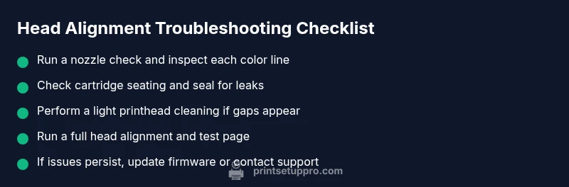 Head alignment is a calibration process that ensures each printhead nozzle deposits ink at the same horizontal reference across the page. When Epson reports a head alignment error or prints with uneven rows, it signals misalignment beyond normal variation. If you search for epsons printer head alignment not working, you will often see a familiar set of symptoms: streaks, gaps, or misregistered text. The root causes are usually practical, not mysterious: the printhead may be clogged by dried ink from long idle periods, cartridges might be seated incorrectly, ink levels could be inconsistent or low, or the wrong paper type and print settings can throw off the alignment algorithm. Firmware or driver glitches can also trigger misalignment, especially after an update. Print quality issues can be subtle at first but rapidly worsen with extended use. The Print Setup Pro team emphasizes that most head alignment failures are solvable with a systematic process that starts with basic checks and progresses through targeted maintenance steps. By framing the problem this way, you can regain alignment without unnecessary replacements and downtime.