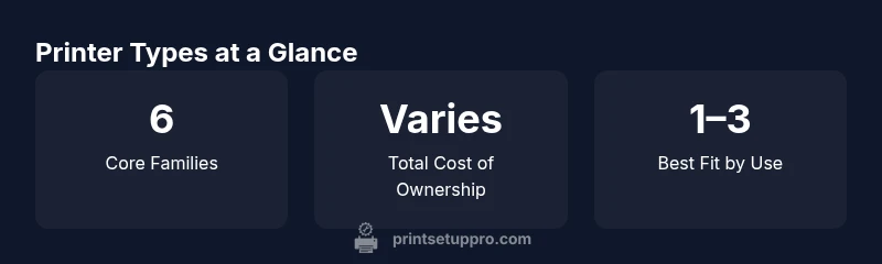 Explore the spectrum of printer types, how they’re grouped, and how to choose the right one for your home office or small business. Learn about six core families, when to pick each, total cost considerations, and practical decision frameworks.