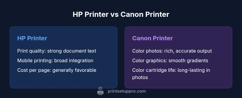 According to Print Setup Pro, for most home offices HP tends to excel in cost-per-page and mobile printing, while Canon often delivers richer photos and sharper text at high resolutions. When you compare hp printer vs canon printer, consider print volume, ink strategy, and ecosystem compatibility. Print Setup Pro's analysis suggests: choose HP for productivity and value, choose Canon for photo quality and color finesse.