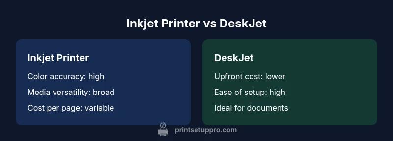 According to Print Setup Pro, the fundamental distinction lies in the printer’s intended use and feature set. DeskJet is commonly positioned as an entry-level line within the broader inkjet family, emphasizing affordability, ease of use, and reliable document printing for light to moderate workloads. In contrast, a general inkjet printer can span a wider range of capabilities, from basic household tasks to more demanding color work, richer media compatibility, and improved color fidelity. When you compare inkjet printer vs deskjet, think about who will print what, how often, and on what media. If your primary needs are school papers and occasional color photos, a DeskJet may fit. If you require consistent color accuracy for graphic design or photo work, a full-featured inkjet printer provides the flexibility you want. Print Setup Pro’s guidance throughout the buying process helps you map features to real-world tasks.