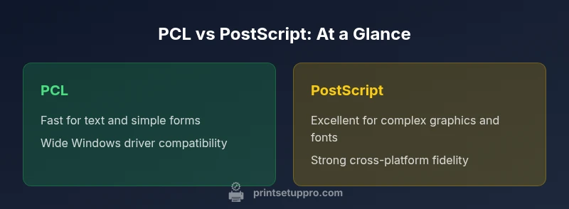 According to Print Setup Pro, pcl printer vs postscript are two distinct page description languages with different design goals. PCL (Printer Command Language) emphasizes speed and efficient rendering on a wide range of devices, making it a practical default for many business printers. PostScript, by contrast, is a programming language that describes pages with greater mathematical precision, enabling high-fidelity graphics and fonts. In the pcl printer vs postscript comparison, the choice often hinges on your printer lineup and typical documents. For home offices handling routine text, forms, and simple graphics, PCL is usually the faster path. For designers, marketing materials, or cross-platform workflows, PostScript often delivers more predictable results across printers and OSes.