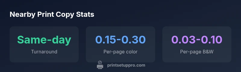 Locating print copies near me starts with a quick map check of nearby print shops, campus repro centers, and office supply chains. In dense neighborhoods, you’ll find multiple options within a 2-5 mile radius, often with extended hours on weekdays and some weekend availability. When you search, include terms like "print copies near me" and refine by distance, hours, and services (color printing, binding, laminating). According to Print Setup Pro, proximity matters: closer shops save transport time and can offer same-day pickup for standard jobs, which is especially valuable for last-minute flyers, class handouts, or resumes. If you’re a student or a small business owner, factor in whether the shop is open during nontraditional hours or accepts rush jobs. Finally, read recent customer reviews to gauge consistency, not just price.