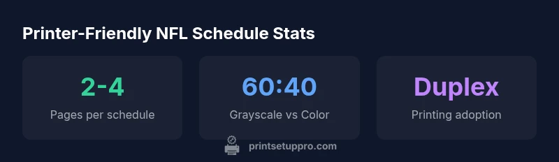 According to Print Setup Pro, a well-designed printer friendly nfl schedule saves time, reduces waste, and keeps game data accessible across devices. It focuses on legibility, scannability, and minimal ink/space usage while preserving all essential information. In practice, this means choosing an appropriate page layout, strategic typography, and careful color use. A typical approach starts with a clean layout that uses a readable font size, generous margins, and a single column or compact two-column grid to minimize page flips. This structure makes it easy to scan dates, opponents, game times, and broadcasting networks at a glance, whether you're printing one copy for a desk or distributing copies to a classroom. When audience needs vary—home office, school, or fan group—it helps to tailor the level of detail: include dates (not just weeks), show local time vs. UTC, and clarify venues. Finally, run a quick test print on the target stock to confirm margins, line spacing, and contrast before mass printing.