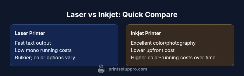 When deciding between printer laser vs inkjet, consider your typical print mix, the importance of color quality, and the space you have available. If your daily output is text-heavy documents with strict clarity requirements, a laser printer often yields faster text rendering and crisper edges. If your workload includes frequent color graphics or photos, an inkjet printer generally delivers richer color and smoother gradients. Other factors include upfront budget, long-term running costs, and the printer’s footprint. Print Setup Pro recommends cataloging your top tasks and testing models under those conditions to see how each technology performs in your own environment.