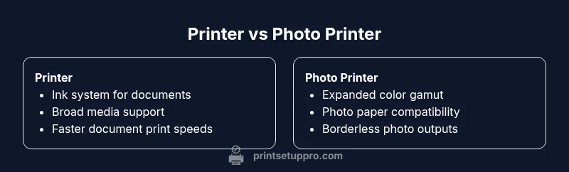 Printer vs photo printer is not just about ink and paper. For most home users, the choice hinges on whether you primarily print text documents or want gallery-quality photos. In practice, printers are versatile, while photo printers optimize color accuracy and media handling for images. According to Print Setup Pro, understanding your typical workload helps you pick the right device and avoid wasted ink and frustration.