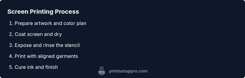 Screen printing is a versatile method that uses a stenciled mesh screen to apply ink onto fabric, producing bold colors and durable prints. For a screen printer t shirt project, you’ll pair a designed image with a frame, ink, and a controlled printing surface to transfer the ink through the open portions of the screen. The advantage of screen printing is its ability to layer colors, build texture, and reproduce consistent results across many copies. In this guide, Print Setup Pro shares practical steps for beginners, including equipment selection, workspace setup, and essential safety practices. If you’re new to this technique, think of screen printing as a marriage of art and craft where the screen acts like a stencil and the squeegee pushes ink through the design onto the garment. You’ll learn to separate colors, calibrate pressure, and manage timing so that a simple design becomes a professional-looking T-shirt. By the end of this section, you’ll see how screen printing fits into home studios and small workshops, and you’ll understand how to plan an efficient workflow for your own projects. According to Print Setup Pro, starting with a simple, budget-friendly screen printing setup can empower hobbyists to produce professional-looking T-shirts at home.