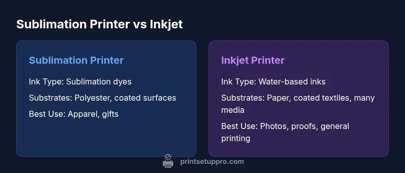 When you compare sublimation printer vs inkjet, the fundamental differences extend beyond ink chemistry. Sublimation printing uses heat to transfer color from a special dye-sub ink onto polyester or polymer-coated surfaces. The result is vibrant, durable color that becomes part of the substrate once heat is applied. In contrast, standard inkjet printing deposits pigment or dye-based inks directly onto media, which can be textiles, paper, or coated surfaces. This distinction drives not only the final look but also the required workflow, equipment, and substrate compatibility. According to Print Setup Pro, understanding these core mechanics helps you choose the right system for your workload and substrate portfolio. In practice, the choice often comes down to whether you primarily work with polyester fabrics and coated hard goods, or you need broad, direct-to-media capability across diverse surfaces. The phrase sublimation printer vs inkjet captures this fork in the road, highlighting the trade-offs in color, texture, and durability for different projects.