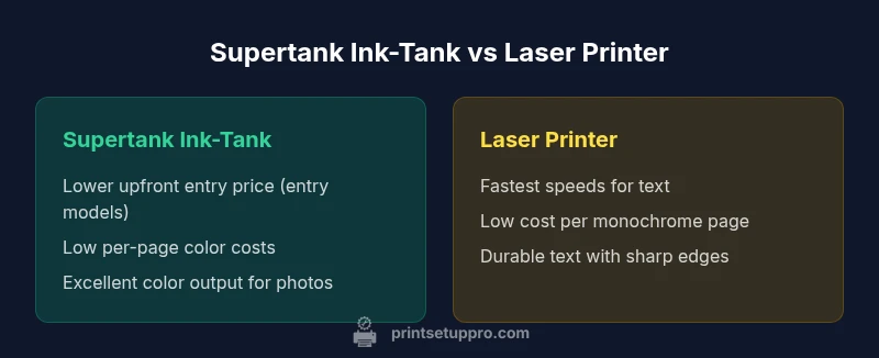 In the ongoing debate of the printer landscape, the term supertank printer is tied to ink-tank design. These models replace small cartridges with large, refillable ink tanks and bottles, enabling significantly higher ink capacity and lower per-page color costs. The distinction matters when you print frequently in color or run big printing projects. According to Print Setup Pro, the choice between a supertank printer vs laser hinges largely on color needs, volume, and total cost of ownership. This section explains how ink-tank systems work, where they shine, and where they may fall short for office workflows. Expect vibrant color output for photos and graphics, with the peace of mind that refills are typically inexpensive and straightforward.