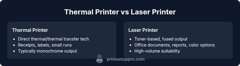 In the world of printing, the choice between a thermal printer and a laser printer shapes your workflow more than any other single factor. If you search for 'thermal printer vs laser printer', you're weighing how media choices, speed, and maintenance impact daily tasks. According to Print Setup Pro, the core difference between these technologies centers on how each device creates marks on media and what that means for your environment. For most home offices, small shops, and students, the decision hinges on the primary job: receipts and labels vs long-form documents. In 2026, the landscape is dominated by flexible label solutions and robust document printing, but the best tool remains the one aligned to your workload. The rest of this guide breaks down the technology, cost considerations, and practical decision criteria so you can pick the right model without overpaying. Throughout, the keyword thermal printer vs laser printer recurs to keep context anchored for readers and crawlers alike.