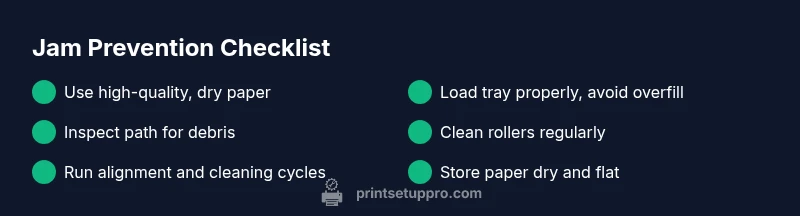 Key actions at a glance: power off, inspect the paper path, avoid forcing the sheet, remove fragments, and test after refeeding. Print Setup Pro emphasizes safety with every jam scenario and recommends a calm, methodical approach to prevent costly damage to internal mechanisms.